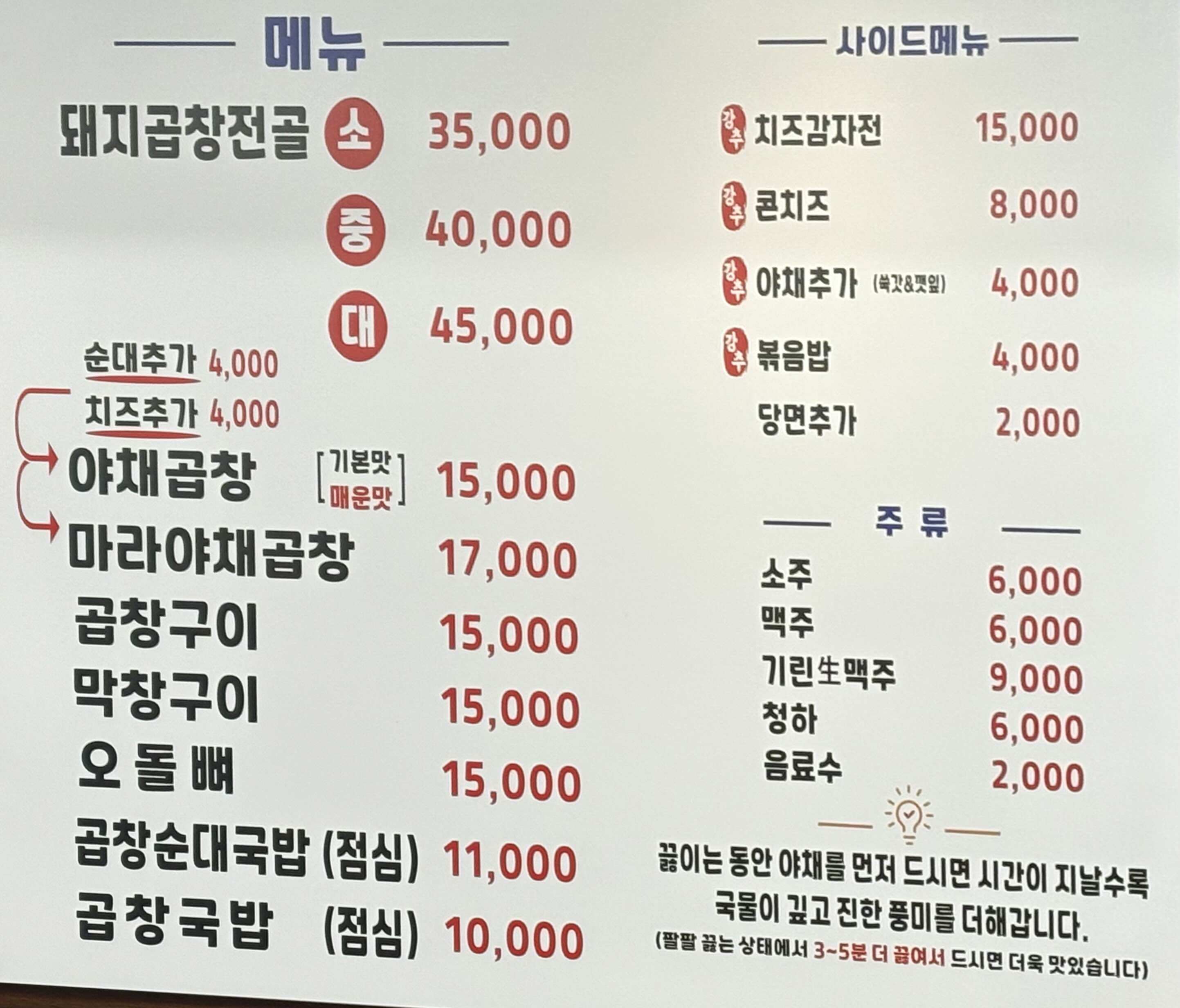 이날 주문한 메뉴는 곱창전골, 야채곱창, 치즈감자전.